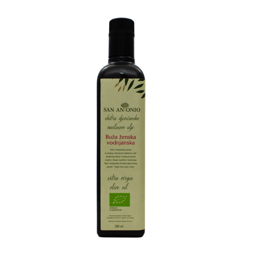 Oliwa z oliwek odmiany Buža ženska vodnjanska charakteryzuje się łagodnym aromatem i smakiem owoców oliwki. Jest to bardzo smaczna, harmonijna oliwa, z delikatnie zaznaczoną goryczką i pikantnością. Zrównoważony aromat jabłka i słodyczy nadają oliwie Buža ženska vodnjanska zapach świeżości.